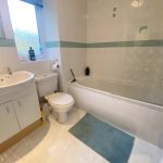 BATHROOM Fitted with a three piece suite comprising panel bath with high level shower and glazed screen, wash hand basin inset into vanity unit and low level W.C. Part tiled walls, tiled floor, heated chrome towel radiator, extractor fan and shaver point.