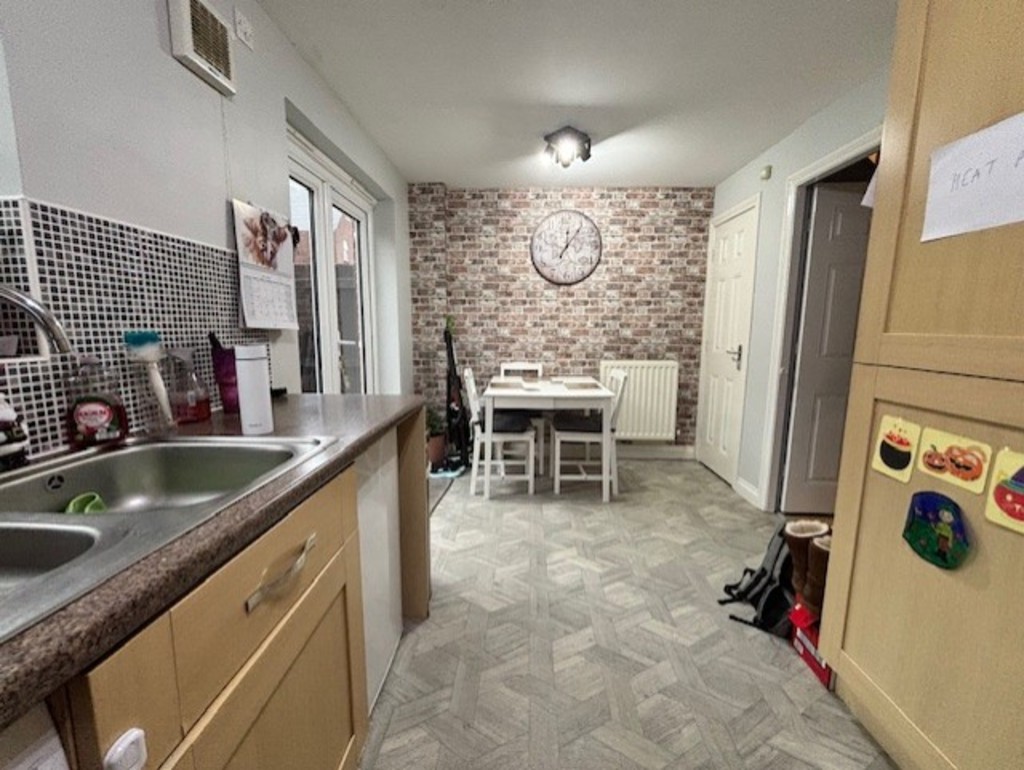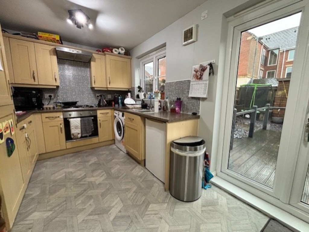 KITCHEN/DINER 15' 0" x 8' 10" (4.57m x 2.69m) Fitted with a range of wood effect base and wall units with roll top work surfaces over incorporating stainless steel sink unit. Built in oven, hob and extractor hood. Built in fridge freezer. Space for washing machine and dishwasher. Understairs storage cupboard. Double glazed window to rear. Double glazed patio door to rear.