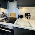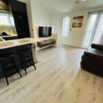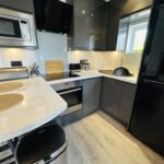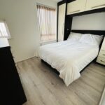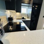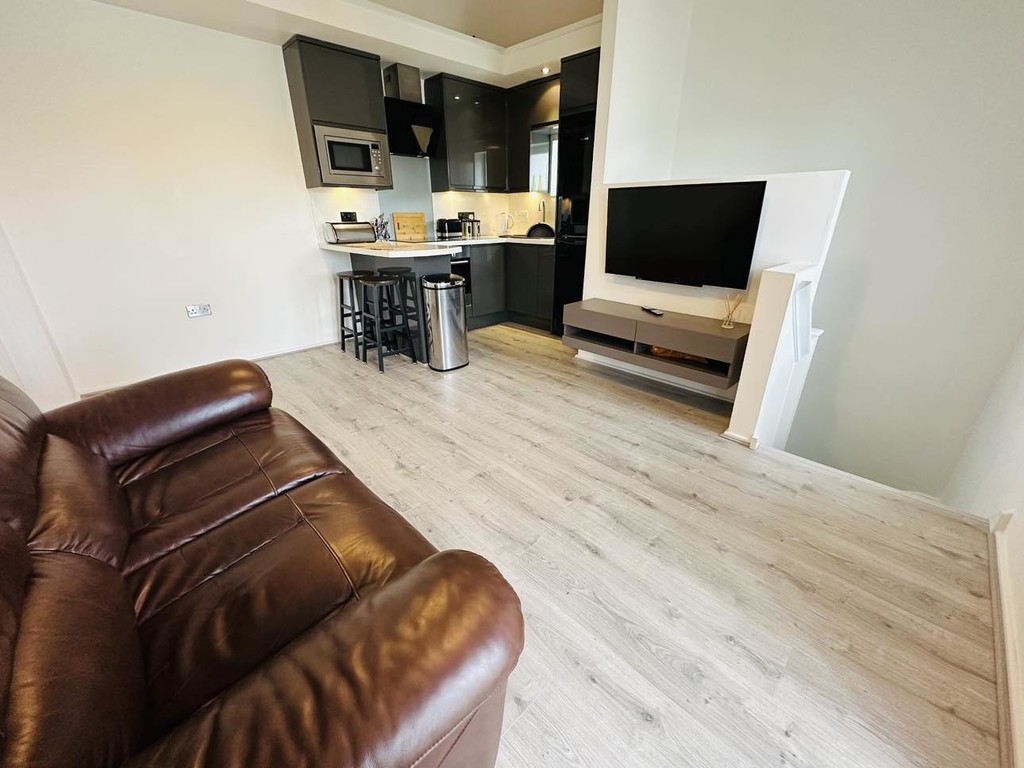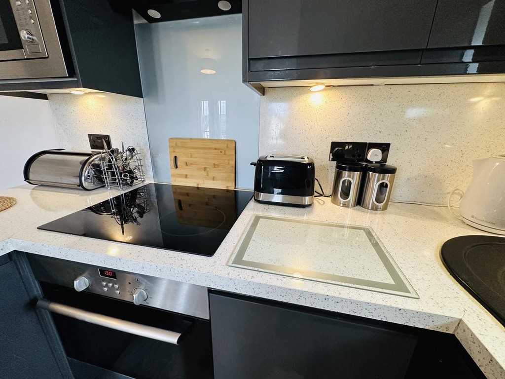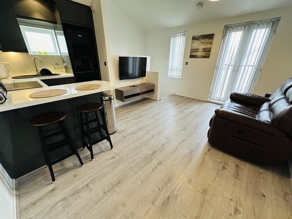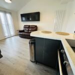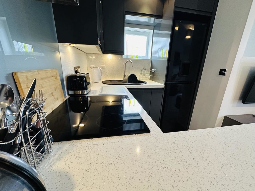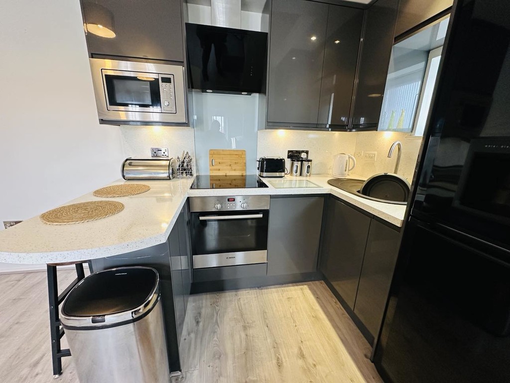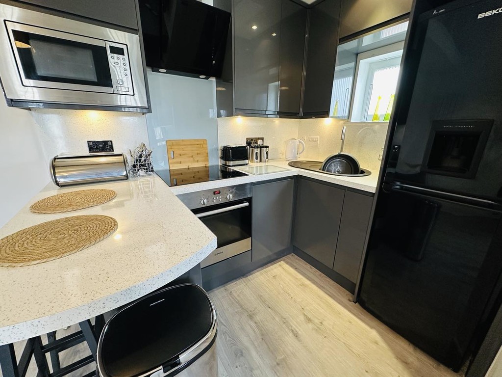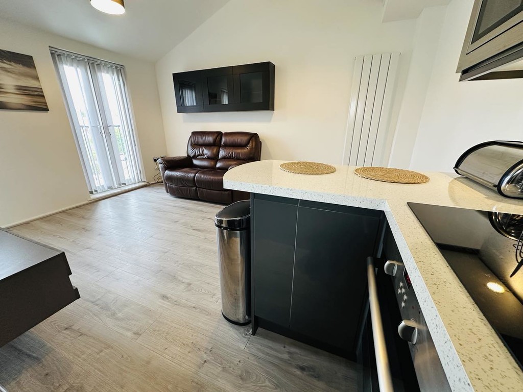 OPEN PLAN LIVING/KITCHEN 14' 11" x 14' 2" (4.55m x 4.32m) Fabulous size living space with vaulted ceilings, double glazed patio doors with Juliet balcony and further double glazed window to front. The kitchen area has been beautifully upgraded to offer a contemporary kitchen with breakfast bar, fridge/freezer. A range of wall and base units in black gloss, single oven and electric hob. Ceiling light point and radiator.