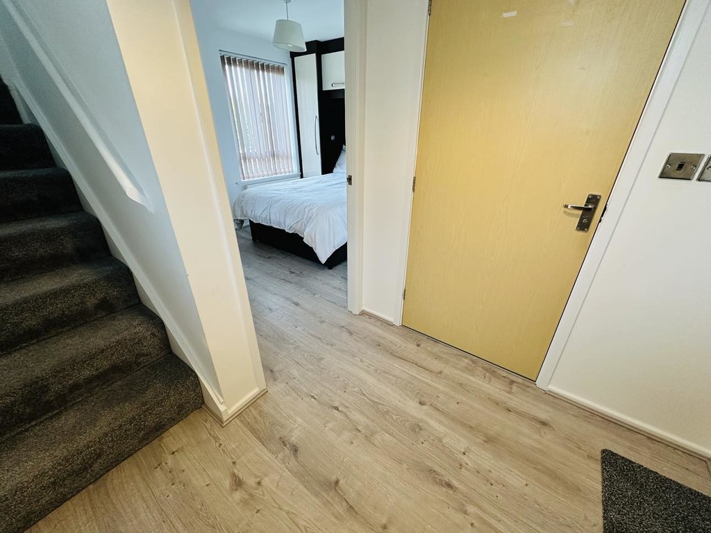 HALLWAY Front door leading to entrance hallway with doors to bedroom and shower room. Ceiling light point, radiator and stairs to first floor.