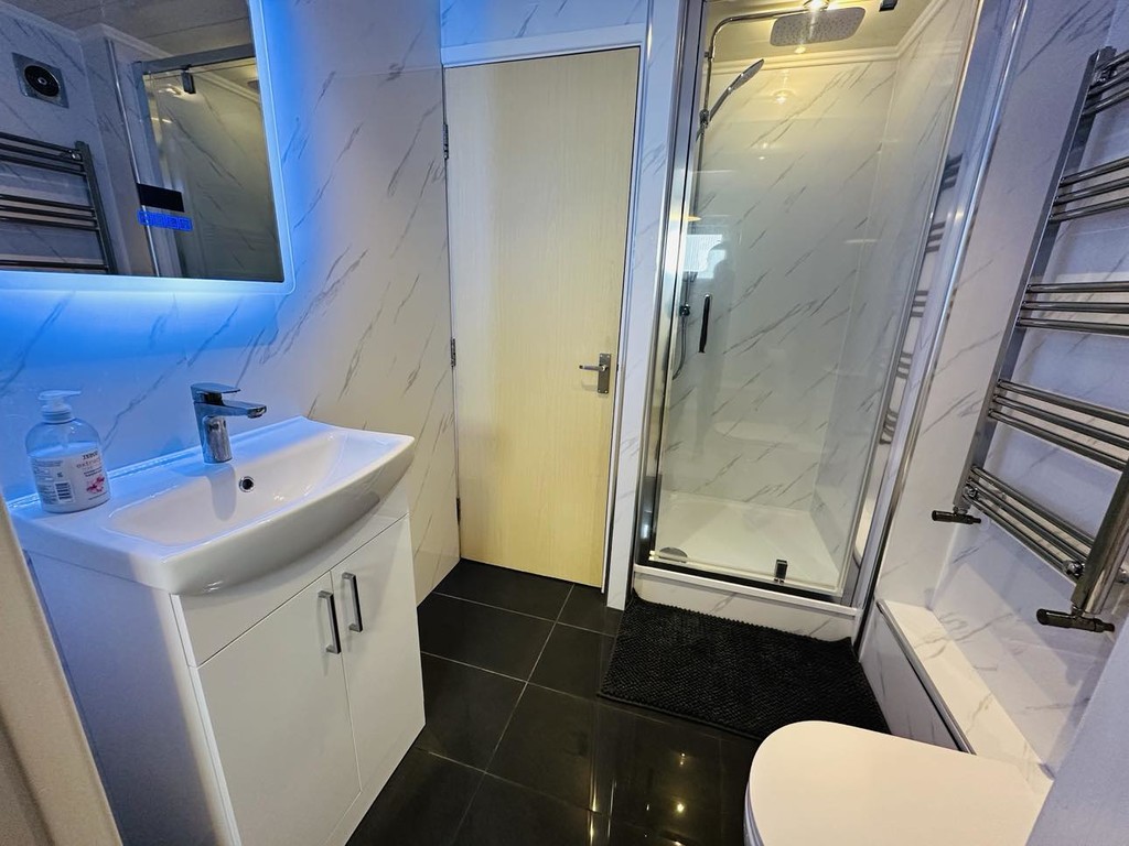 SHOWER ROOM Recently refitted enclosed single shower cubicle, utility cupboard with plumbing for washing machine, low level WC and wash hand basin with vanity unit and illuminated mirror. Vinyl flooring, ceiling light point and radiator.