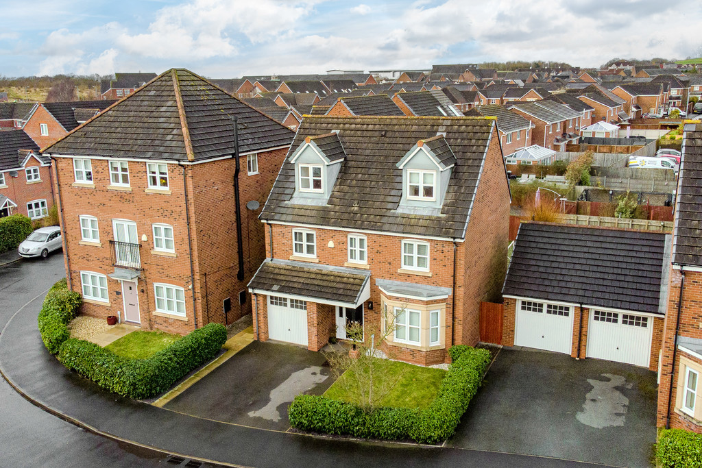 OUTSIDE Outside, the property features an oversized, integral garage, ideal for storage, and a double fronted driveway capable of accommodating two cars. The rear garden, primarily lawned with ample patio space and not directly overlooked, provides a cosy outdoor space for relaxation.