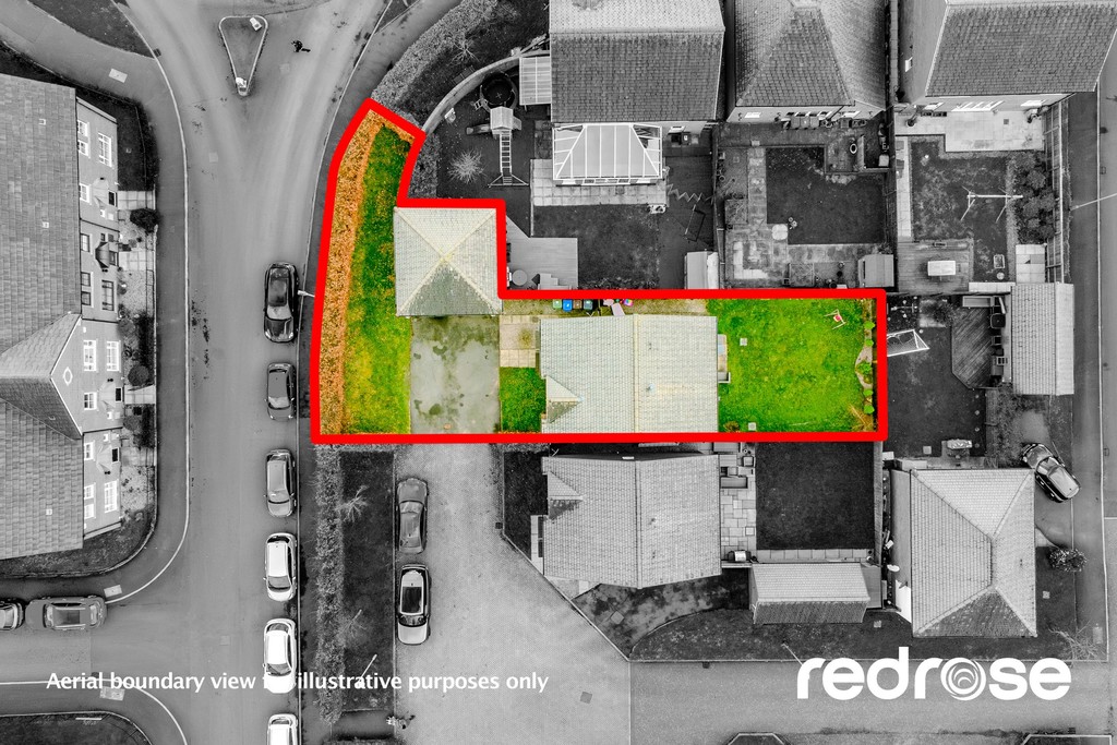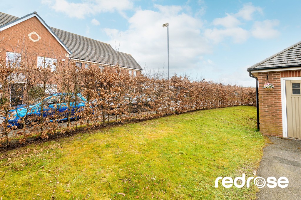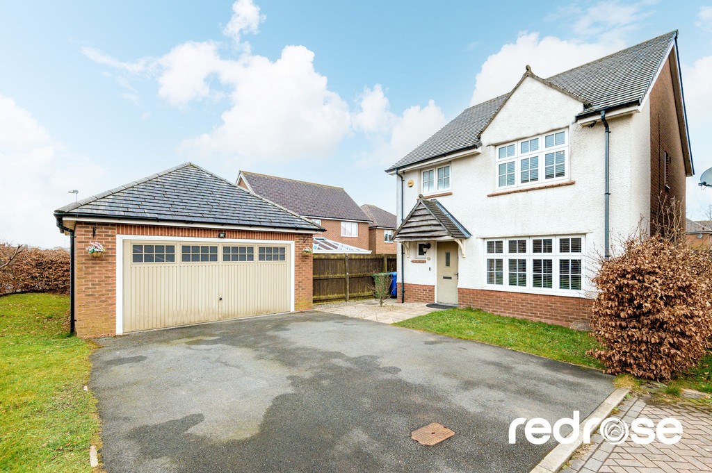 OUTSIDE FRONT Situated at the head of a quiet cul de sac on arguably the largest plot surrounded by established bushes and large lawn area. Double width driveway leading to double garage and pathway leading to front door.
