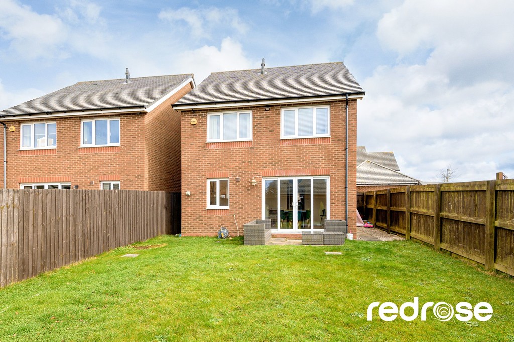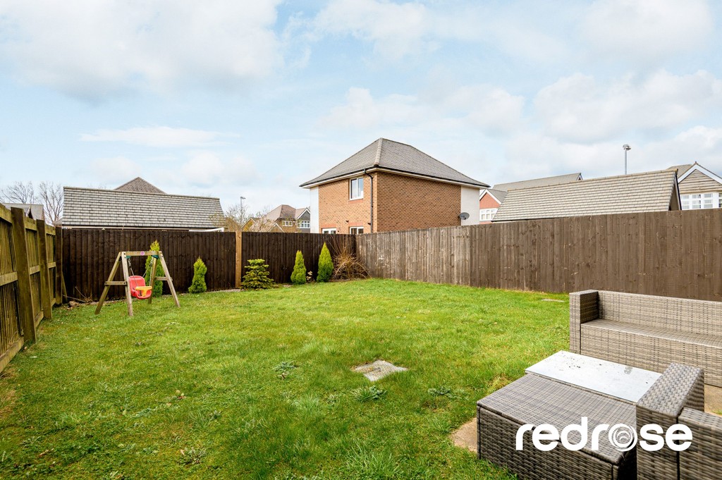 OUTSIDE REAR West facing, larger than average and beautifully manicured rear garden, mainly laid to lawn with established borders and patio area leading from the dining room. Fenced to all sides with gate access to the side leading to the parking and garage at the front.
