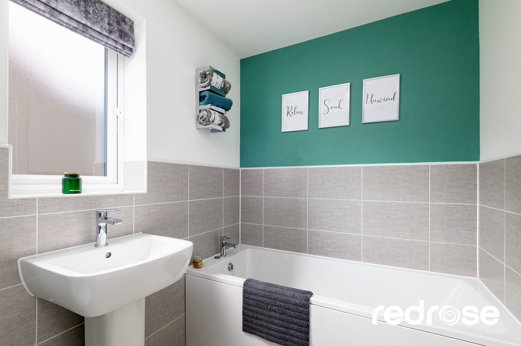 FAMILY BATHROOM Three piece bathroom suite with bath, low level WC and wash hand basin. Double glazed window to rear, down lights, radiator and vinyl flooring.