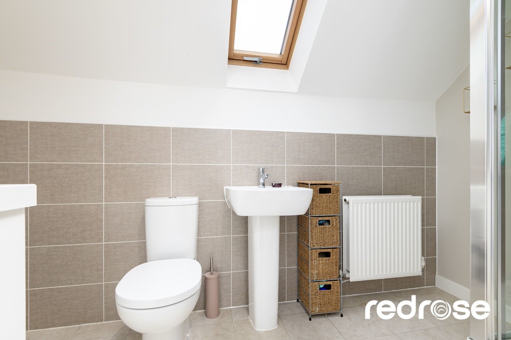 EN-SUITE 10' 11" x 5' 2" (3.33m x 1.60m) Larger than average en-suite bathroom with walk in shower cubicle, low level WC and wash hand basin. Velux window to rear, heated towel rail, vinyl flooring and downlights.