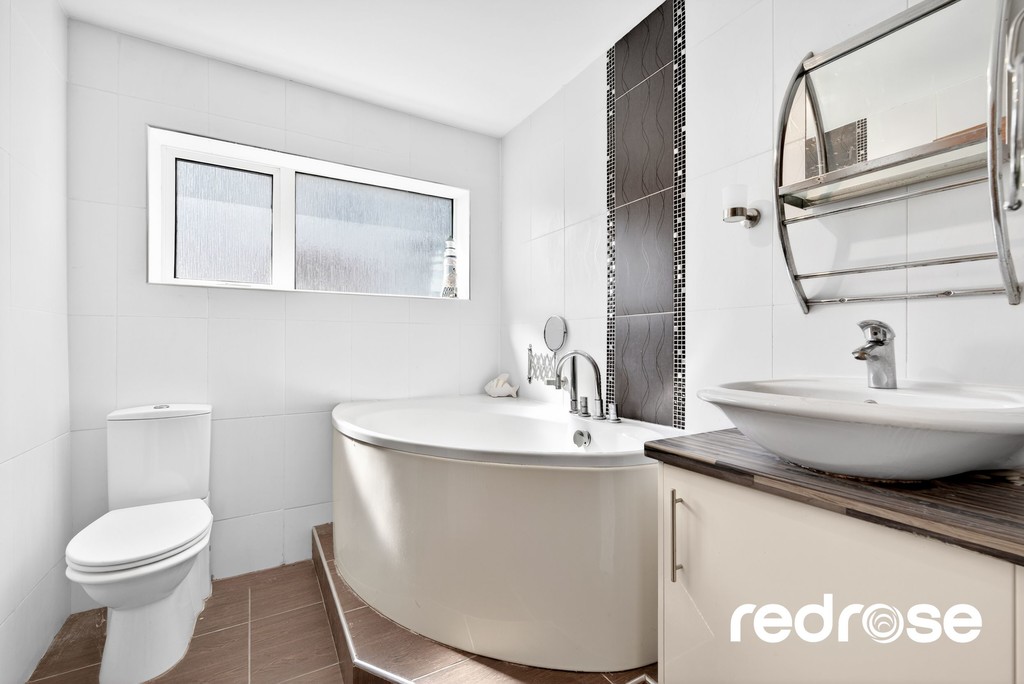 BATHROOM 7' 4" x 7' 3" (2.24m x 2.21m) UPVC double glazed frosted window, corner panelled bath, vanity-top wash basin, dual flush WC, central heating radiator, tiled walls, and tiled flooring.