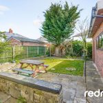 REAR Enclosed garden with paved patio, lawn area, planted beds, and access to the garage.