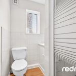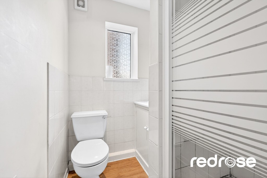 SHOWER ROOM 6' 5" x 5' 6" (1.96m x 1.70m) UPVC double glazed frosted window, central heating radiator, electric feed shower unit, low-level WC, partially tiled walls, and wood-effect flooring.
