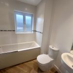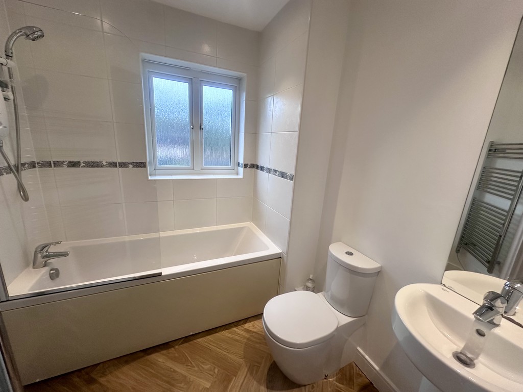 BATHROOM Fitted with a three piece in white comprising of panel bath with high level shower fitting and glazed screen and mixer tap, pedestal wash hand basin and mixer tap along with Low Level W.C. Part tiled walls, double glazed frosted window and heated chrome towel radiator.