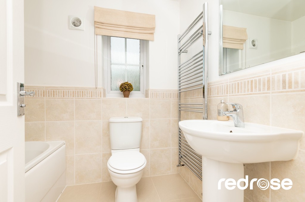 BATHROOM A stylish and practical family bathroom featuring a modern three-piece suite, including a panel bath, wash basin, and low level W.C. Neutral tiling and contemporary fixtures create a bright, clean, and inviting space suitable for all the family. Double glazed frosted window to the front aspect and heated radiator.