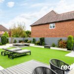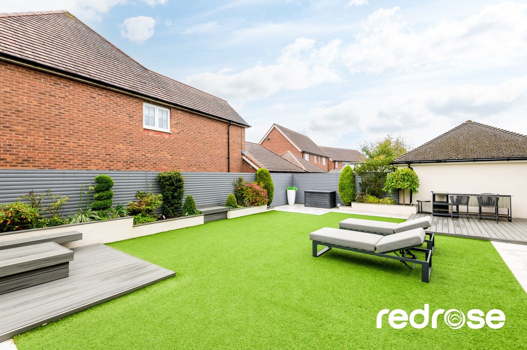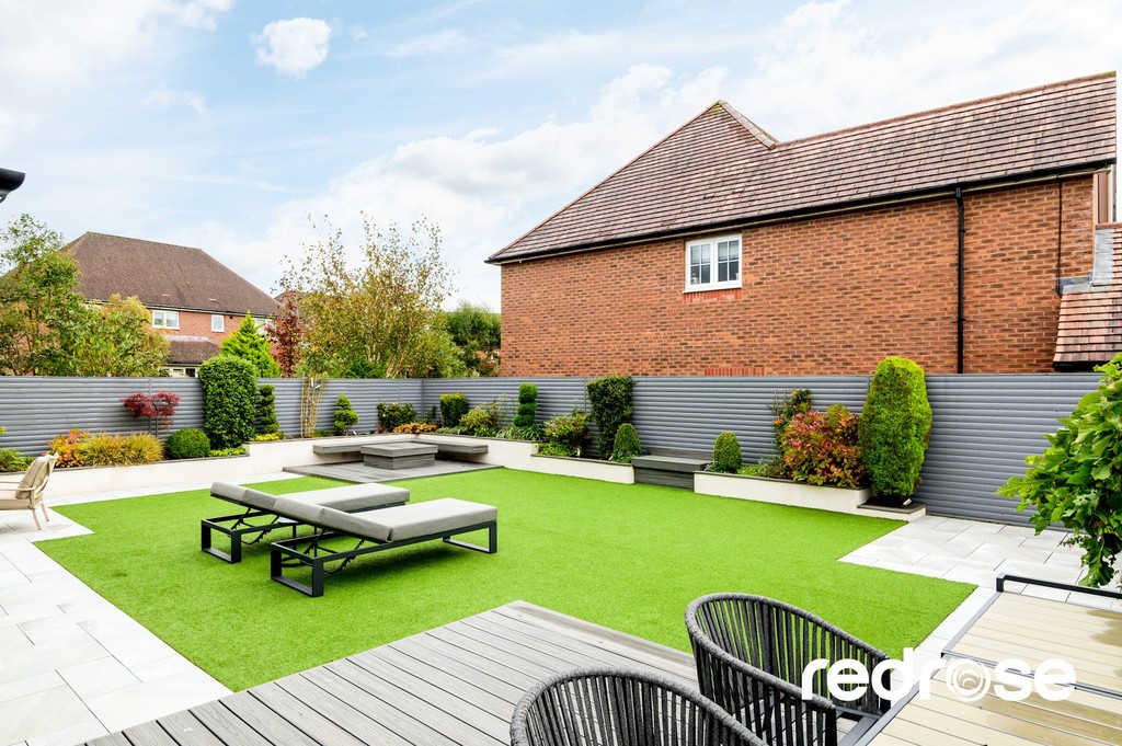 OUTSIDE - REAR A contemporary low-maintenance garden with artificial lawn, two composite decked terraces featuring uplights, raised borders with integrated lighting, strip lighting, and additional patio areas, offering a high level of privacy.