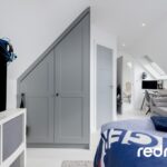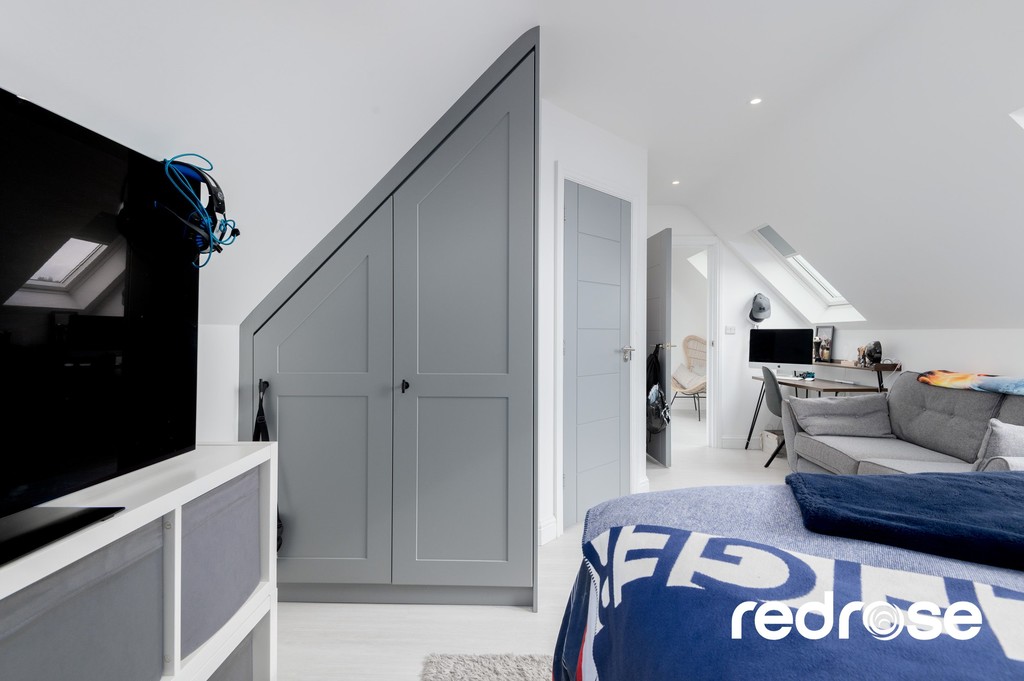 BEDROOM SIX 13' 1" x 18' 0" (4.0m x 5.5m) A spacious bedroom with Velux windows, fitted wardrobes, downlights, and a dwarf door leading to eaves storage. The room also includes a door to an en-suite.