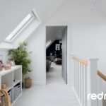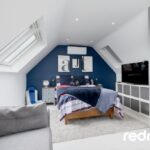 Stairs ascend from the first-floor landing to the second floor, where Velux windows at the front and rear flood the area with light. There is a feature display shelf, and doors lead to bedrooms five and six, as well as loft storage via a dwarf door.