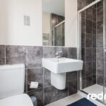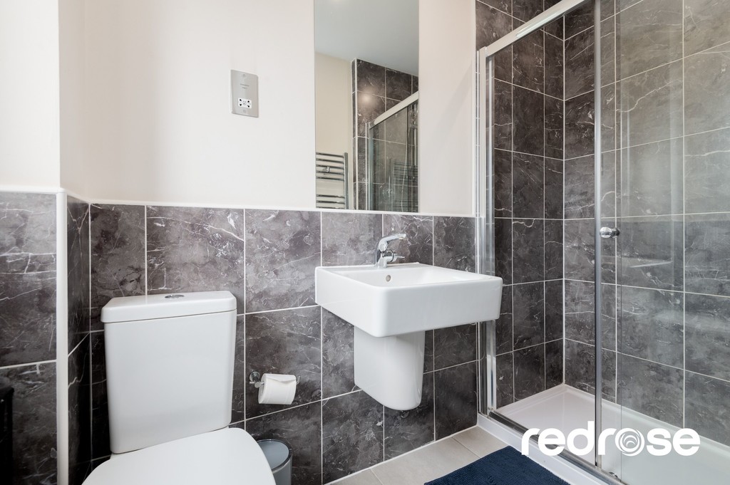 This en-suite includes a walk-in double shower cubicle, WC, washbasin, heated towel rail, double-glazed window, downlights, and fully tiled flooring and walls.
