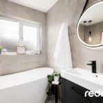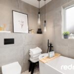 A beautifully refitted three-piece suite featuring a freestanding bath, WC, washbasin with motion sensor mirror, double-glazed window, heated towel rail, tiled flooring, and drop pendant lighting.