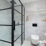 A luxurious, refitted en-suite featuring Roccia tiled flooring and walls, a walk-in wet room with a contemporary shower enclosure, downlights, a WC, and double his-and-hers vanity units with motion-sensor mirrors. The space also includes a wall-mounted cordless electric toothbrush holder, heated towel rail, and a double-glazed window.