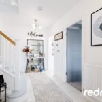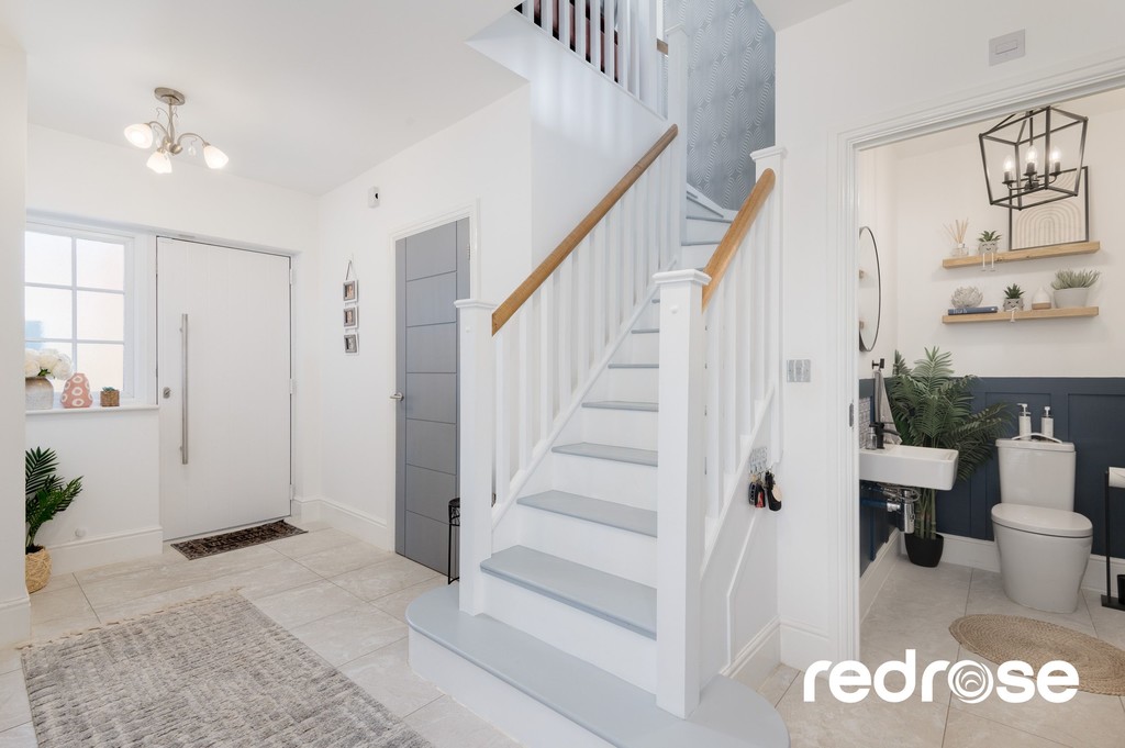 A composite front door opens into a spacious and bright hallway. Upgraded doors lead to the cloakroom, lounge, and kitchen. There's also a door to a storage cupboard, and stairs ascend to the first floor. The hallway is equipped with modern light fittings, a radiator, and laminate flooring.