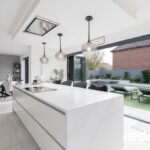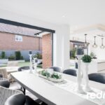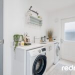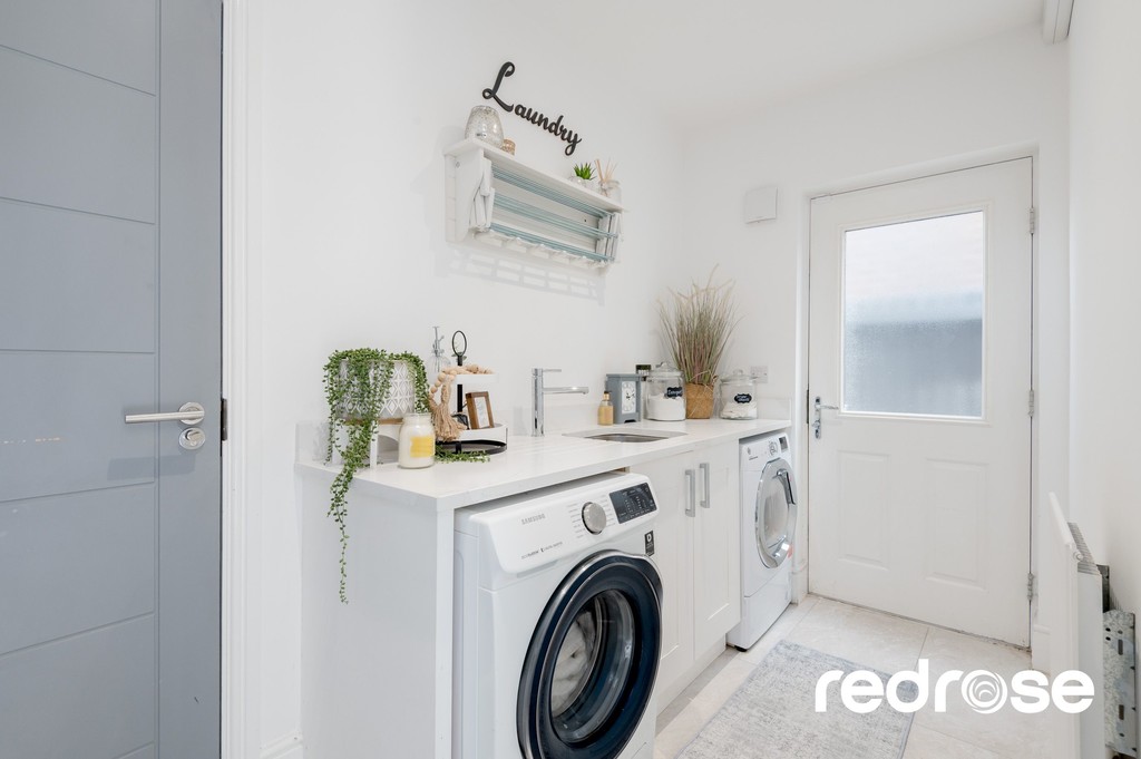 Bespoke units topped with Oro Quartz, space for a washing machine and tumble dryer, sink, quality tiled flooring, and access to the side of the property. Upgraded doors lead to the double garage and the understairs cupboard.