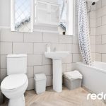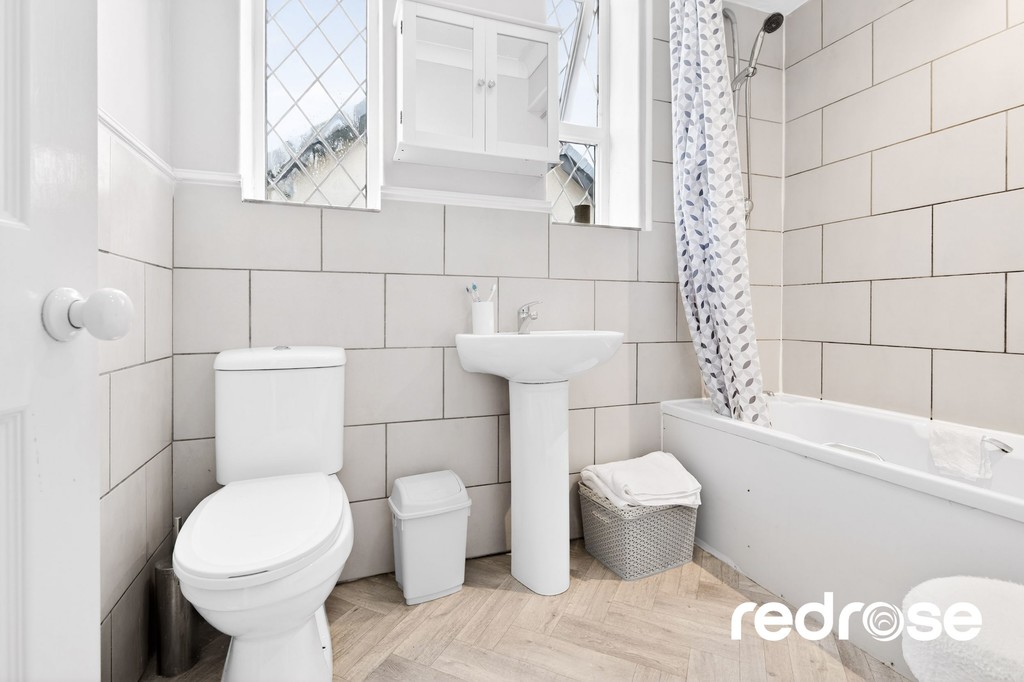 FAMILY BATHROOM A modern three-piece suite comprising a WC, pedestal wash hand basin, Two double-glazed windows to the side fill the room with natural light, while a panel radiator adds comfort and warmth. Stylish and functional, this space provides both practicality and a contemporary feel.