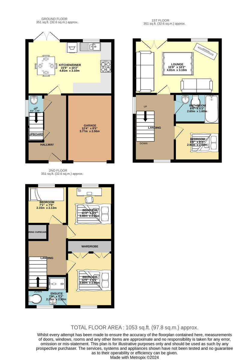 EN-SUITE 7' 2" x 7' 2" (2.2m x 2.2m) Double glazed window to front, three piece bathroom suite with fully tiled shower cubicle, low level WC and wash hand basin. Vinyl flooring, radiator and downlights.