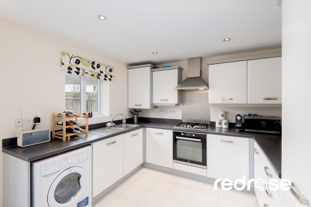 KITCHEN/DINER 10' 2" x 15' 8" (3.1m x 4.8m) Range of wall and base units in white with contrasting worktops. Space for washing machine, single oven, 4 ring gas hob with extractor fan over and 11/2 bowl stainless steel sink. Double glazed window to rear garden, double glazed patio doors to rear garden, vinyl flooring and downlights.