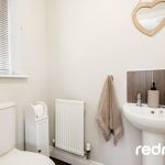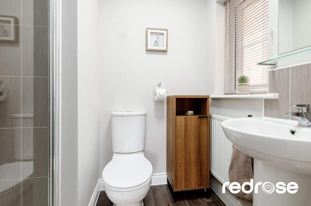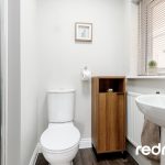 DOWNSTAIRS W.C A modern and practical downstairs cloakroom comprising a low-level W.C. and wash hand basin with tiled splash back, finished in a neutral style-ideal for guests and everyday family use.