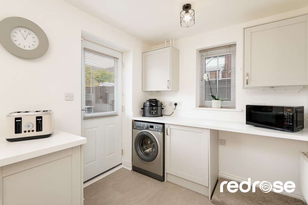 UTILITY AREA A useful and well-planned utility room providing additional storage and workspace, with plumbing for laundry appliances and direct access to the garden. Perfect for keeping household tasks separate from the main kitchen and maintaining a clutter-free living space. Base units with complimentary work surfaces over and space for white goods. Door to the rear garden.