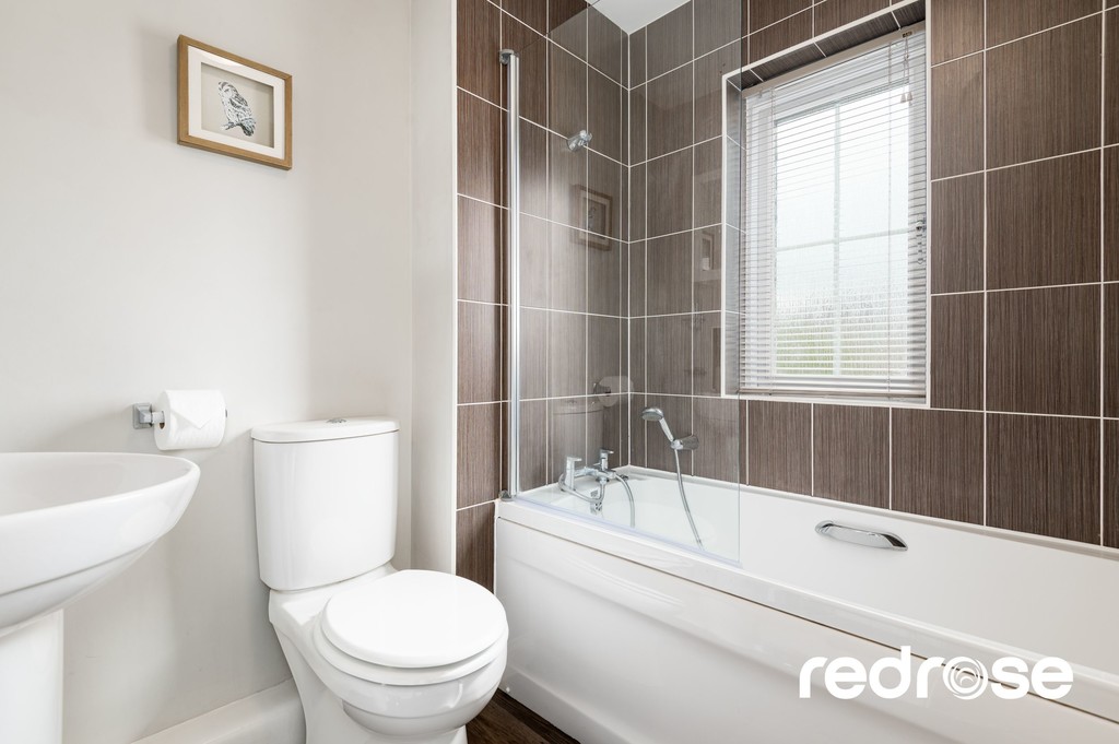 FAMILY BATHROOM A stylish and practical family bathroom featuring a modern three-piece suite, including a panel bath with high and low level shower fitting and glazed shower screen, pedestal wash basin with chrome mixer tap and low level W.C. Neutral tiling and contemporary fixtures create a bright, clean, and inviting space suitable for all the family. Double glazed window to the front aspect and radiator.
