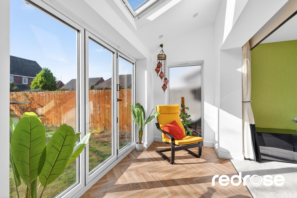 SUN ROOM 10' 11" x 4' 10" (3.33m x 1.47m) A stunning rear extension creating a bright and open-plan living space with Vinyl flooring seamlessly connecting the indoors with the outdoors through full-width bi-fold doors. Flooded with natural light, it offers a perfect setting for modern family living and stylish entertaining, opening directly onto the south-facing landscaped garden.