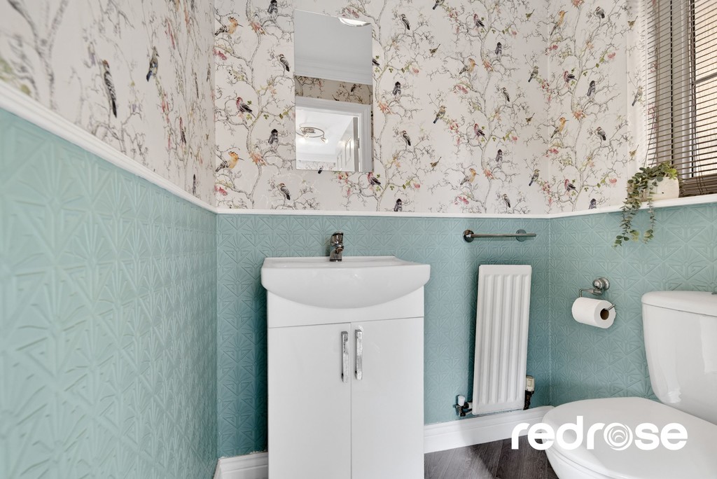 DOWNSTAIRS W.C A convenient downstairs W.C., fitted with a modern two-piece suite comprising a toilet and wash hand basin. Ideal for guests and everyday use, it offers practical functionality while maintaining a clean and contemporary feel. Double glazed frosted window to the side aspect and radiator.