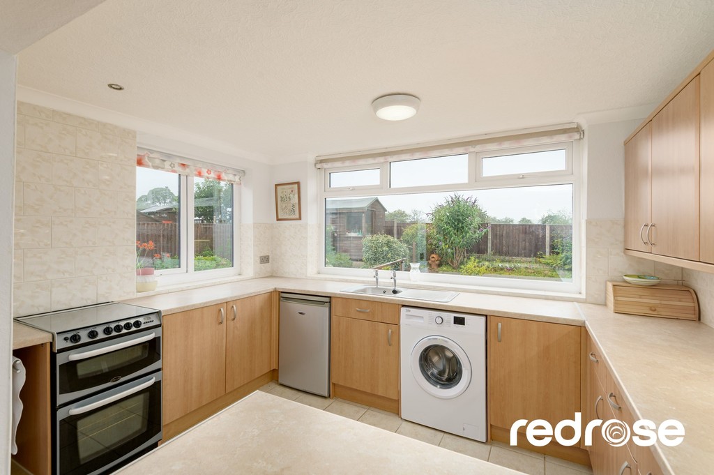Kitchen has built-in wall and base units, large triple glazed side and rear windows providing views to the generous sized rear garden and patio.