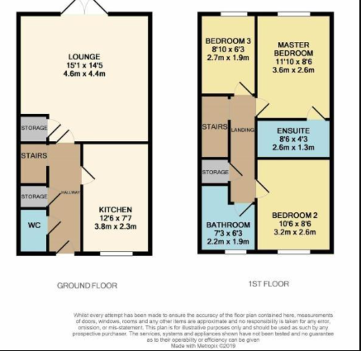 ENSUITE 8' 5" x 4' 3" (2.57m x 1.3m) Beautifully presented three-piece suite comprising a fully enclosed shower cubicle with electric shower, low-level W.C., and pedestal wash hand basin. Finished with part-tiled walls, extractor fan, and single radiator.