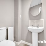 DOWNSTAIRS WC Fitted with a modern two-piece suite comprising a low-level W.C. and corner wash hand basin with tiled splashback, complemented by a single radiator.