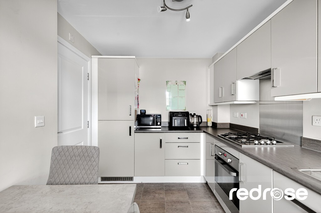 KITCHEN Fitted with a stylish kitchen is fitted with a range of modern grey wall and base units complemented by contrasting work surfaces. Includes an integrated electric oven with gas hob, stainless steel splashback and extractor hood, stainless steel sink and drainer with mixer tap, as well as integrated washer/dryer, dishwasher, and fridge freezer. Double-glazed window to the front, and double radiator.