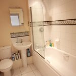 BATHROOM 6' 5" x 6' 1" (1.96m x 1.87m) Three piece white suite with W.C, wash hand basin with partially tiled splash back, bath with shower and shower screen, partially tiled elevations and heated towel rail.
