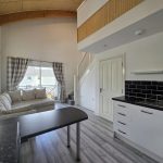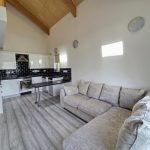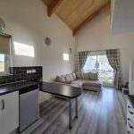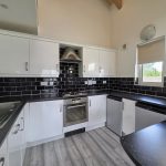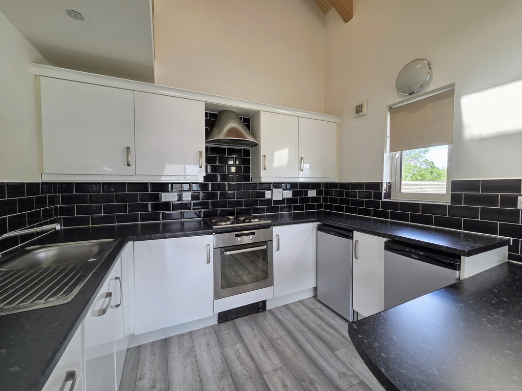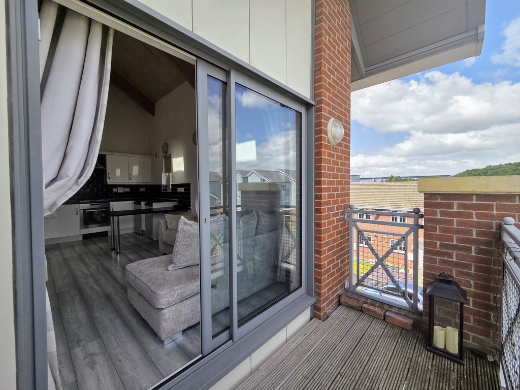 A contemporary kitchen, fitted with sleek modern units and equipped with an integrated electric oven and four-ring hob with extractor hood and curtesy light. Stainless steel sink, with drainer and mixer tap. Part tiled walls, space for white goods. Designed for both style and functionality, the kitchen offers ample workspace and seamlessly flows into the open-plan lounge, creating an ideal space for cooking and entertaining. Double glazed window and Patio doors to the balcony The open-plan lounge leads seamlessly onto a private front-facing balcony, creating a versatile space to enjoy fresh air, soak up the morning sun, or entertain guests in a bright and airy setting.