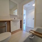 BATHROOM A stylish bathroom featuring a modern three-piece suite with bath, low level WC, and wash hand basin inset into vanity unit with mixer tap over. Designed with both practicality and aesthetics in mind, it offers a contemporary and inviting space for family living. Part tiled walls and laminate flooring.